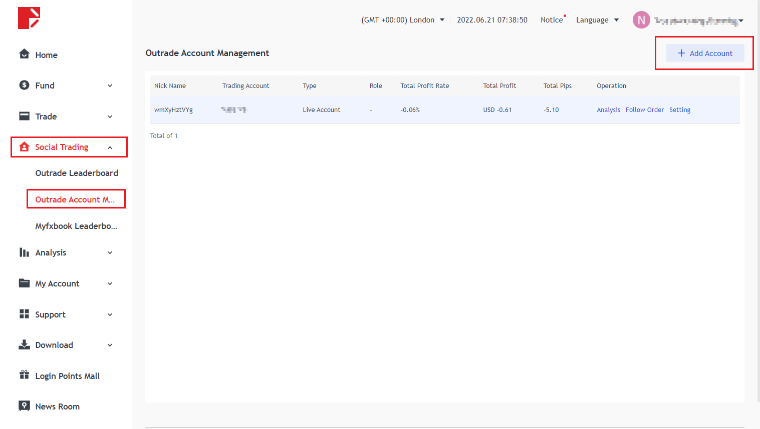 قم بتسجيل الدخول إلى Doo Prime User Center ، وانقر فوق "Community Trading" على الجانب الأيسر من الصفحة الرئيسية ، وانقر فوق "Outrade Account Management" ، وانقر فوق Add Account على الجانب الأيمن من الصفحة ، وحدد دور "Trader" أو "Follower" ، وأخيرًا ربط الحساب الذي هو Can.