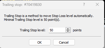 Please click "Trade" in the terminal bar to view existing orders, then right-click to select the holding order, click "Trailing Stop" and select "Custom", and fill in the number of trailing stop points you need to set.