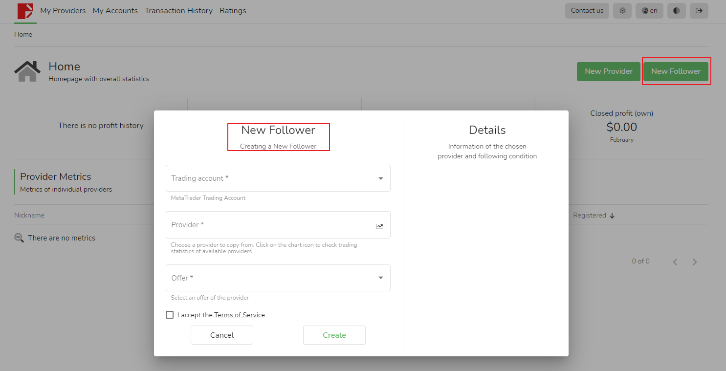 En la página [Mi cuenta] del seguidor, puede agregar una nueva cuenta comercial haciendo clic en el botón verde [Crear]. Sin embargo, esta cuenta no se puede utilizar para iniciar sesión y solo se puede seleccionar como fuente de señal, seguidor o configurada para recibir tarifas de rendimiento.