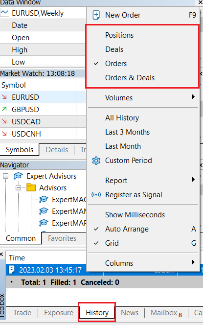 En la caja de herramientas de MT5, haga clic en [Historial], haga clic con el botón derecho para seleccionar cualquier transacción y puede configurar para ver los registros históricos en diferentes métodos de visualización, que se pueden dividir en cuatro métodos:
