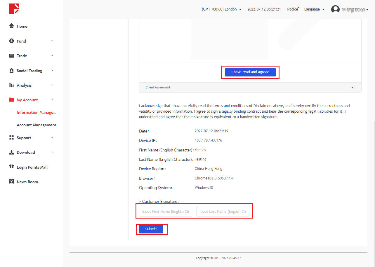 클라이언트 계약 및 위험 승인 및 공개의 이용 약관을 주의 깊게 읽고 기입된 정보가 사실이고 유효한지 확인한 다음 "클라이언트 서명"(병음)에 귀하의 성과 이름을 다시 입력하십시오. 이 법적 구속력이 있는 계약에 서명하는 데 동의한 다음 확인을 클릭합니다.