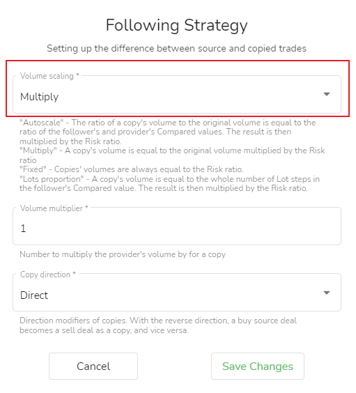 - 카피 계정의 만기 포지션은 시그널 소스 계정의 거래량에 거래량 승수를 곱한 것과 같습니다.