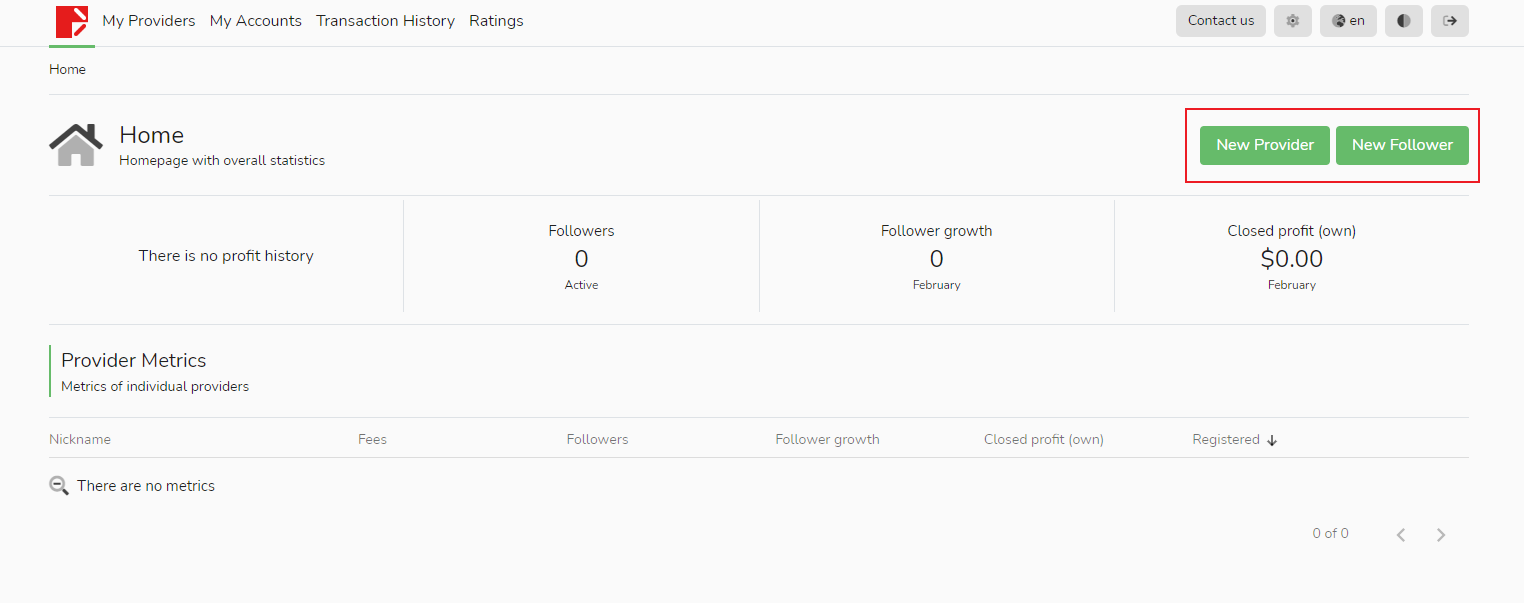 시그널 소스의 [내 계정] 페이지에서 녹색 [만들기] 버튼을 클릭하여 새 거래 계정을 추가할 수 있습니다. 단, 이 계정은 로그인에 사용할 수 없으며 시그널 소스, 팔로워로 선택하거나 실적 수수료를 받는 설정만 할 수 있습니다.