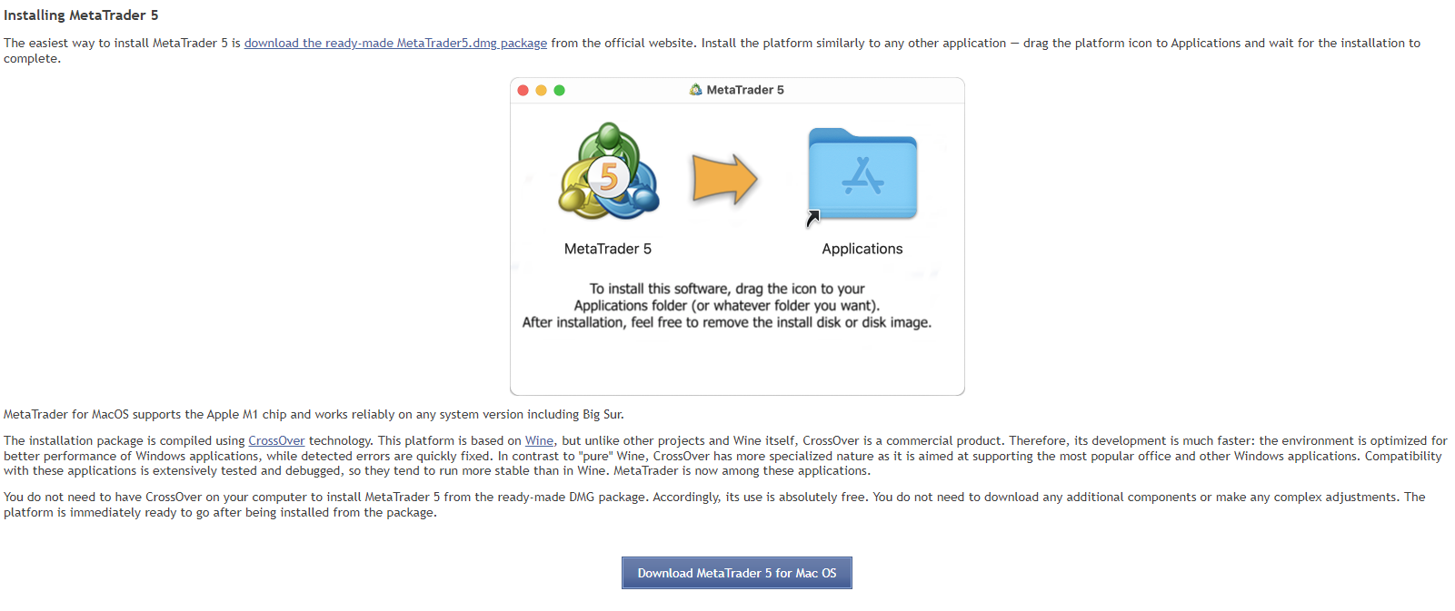 다운로드할 [macOS]를 선택하면 다음 페이지로 이동합니다. [macOS용 MetaTrader 5 다운로드]를 클릭합니다.