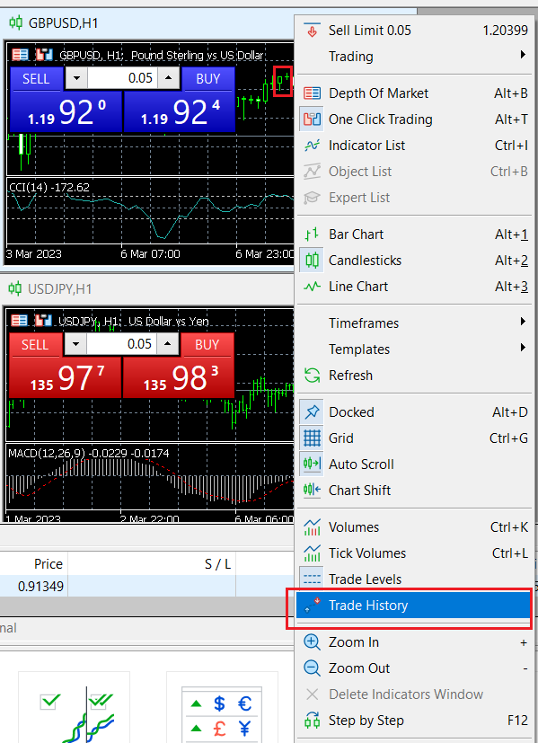 이 기능이 필요하지 않은 경우 다음과 같이 닫을 수 있습니다. 차트의 빈 공간에 마우스를 대고 우클릭하여 체크된 [거래 내역]을 제거합니다.