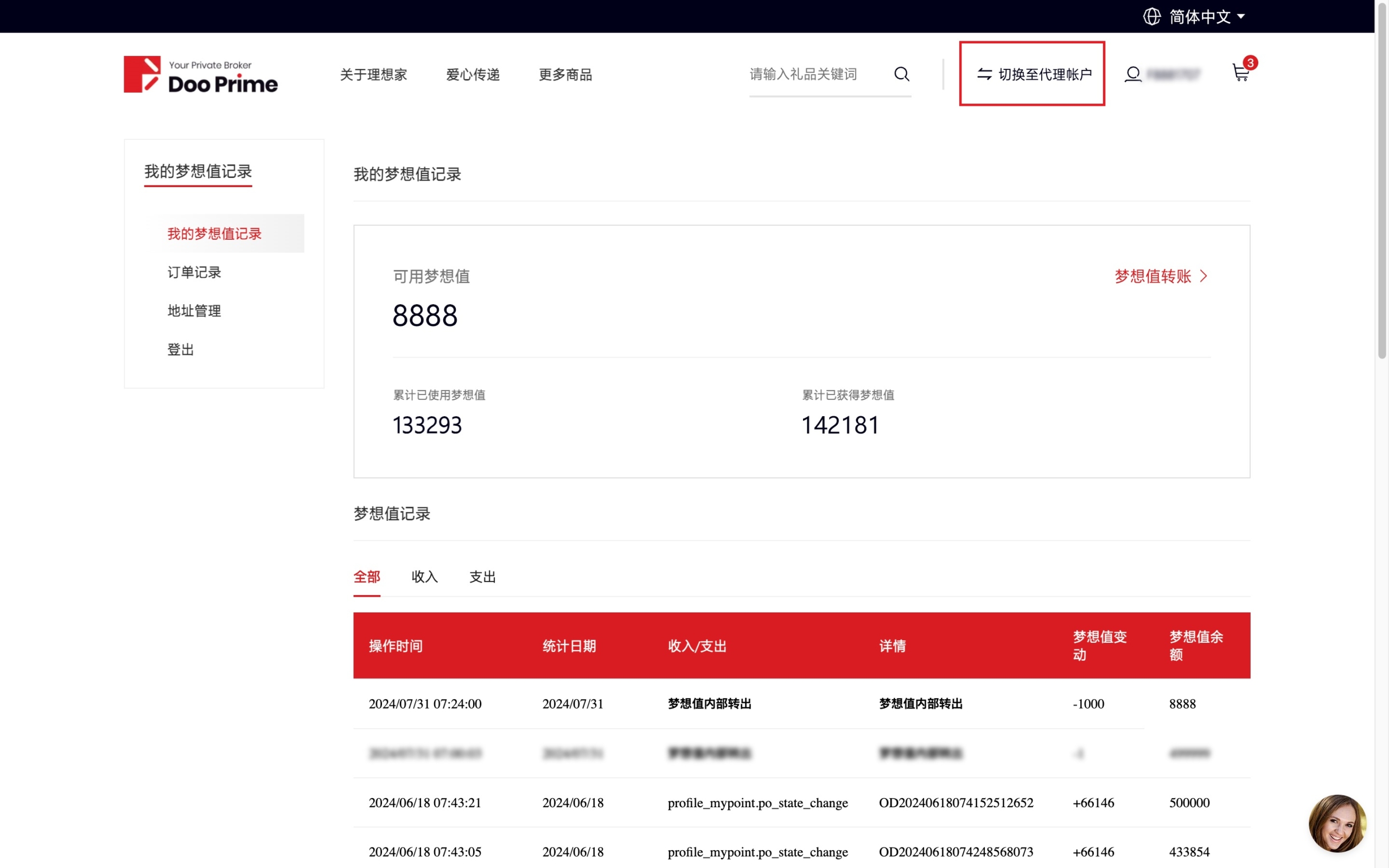 於導覽列右上角切換帳號角色,查看同名帳戶積分狀況。