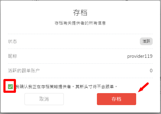 存檔意味著該信號被下架,跟隨者將無法繼續跟隨,且信號源無法再次激活或上架該信號,只能選擇重新發布新信號。