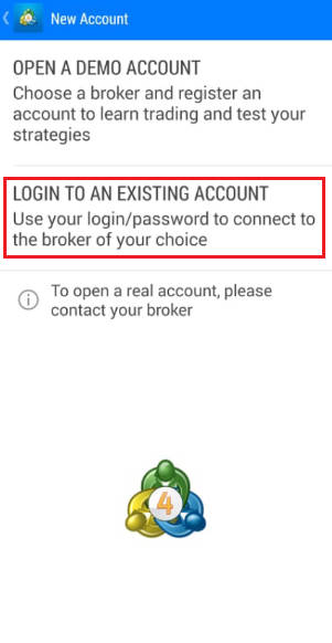 安裝好MetaTrader 4 手機版之後點開軟件進入到登陸頁面,如果已經開立真實賬戶,請選擇「登陸一個已有賬戶」。
