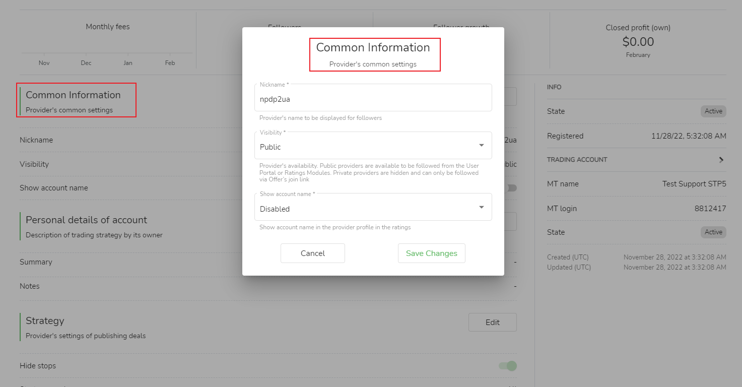 Tài khoản chấp nhận phí hiệu suất:Tài khoản giao dịch mà nguồn tín hiệu thu thập người theo dõi để trả phí hiệu suất cho nguồn tín hiệu có thể chọn tài khoản hiện có hoặc thêm tài khoản mới. Trong quá trình thêm tài khoản mới, bạn cần điền vào tài khoản giao dịch (nghĩa là tài khoản giao dịch trong MetaTrader) và mật khẩu (nghĩa là Mật khẩu giao dịch MetaTrader) và sau đó nhấp vào [Lưu thay đổi] để hoàn tất cài đặt thành công.